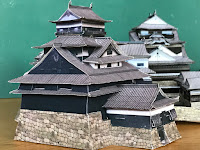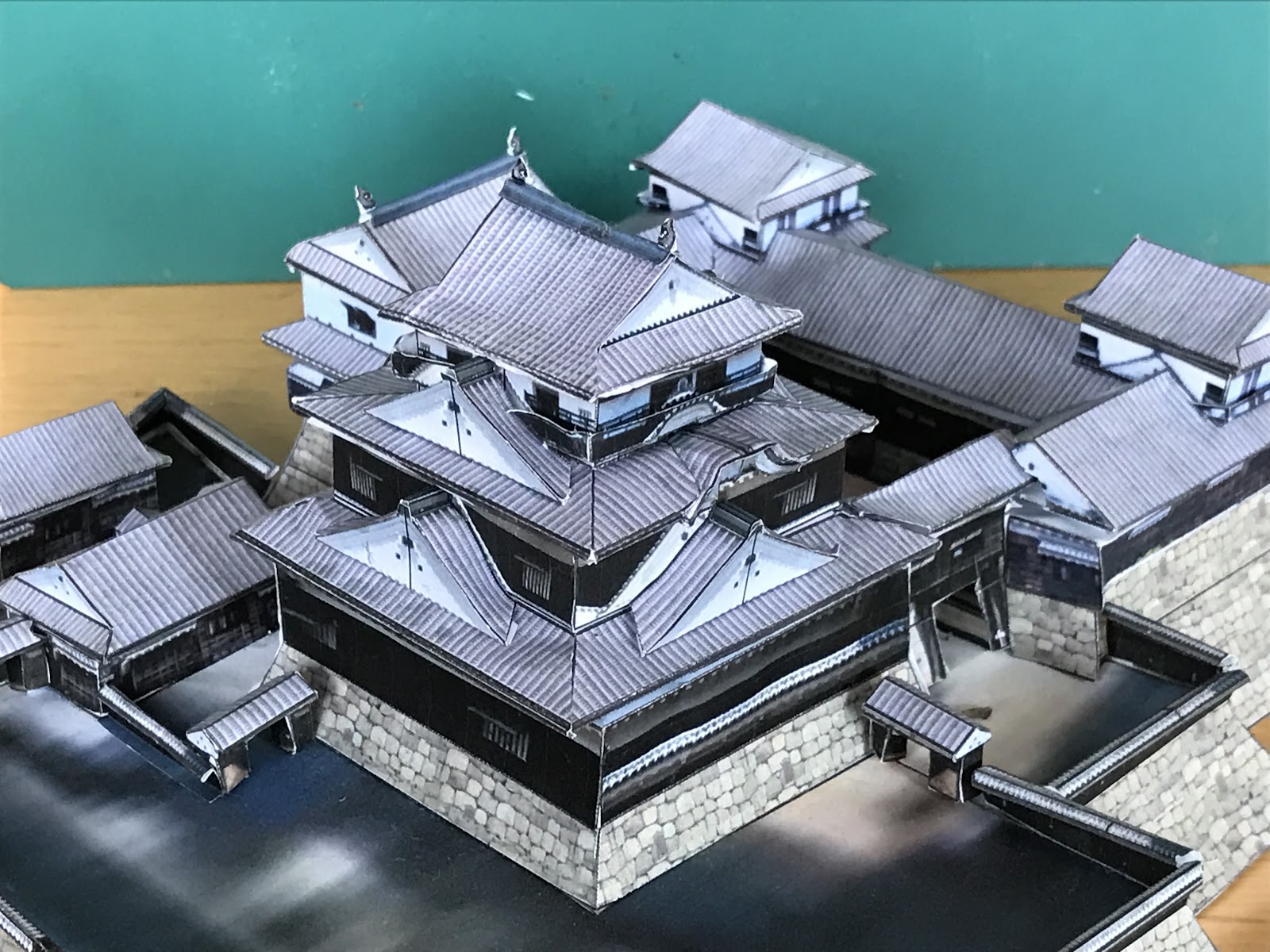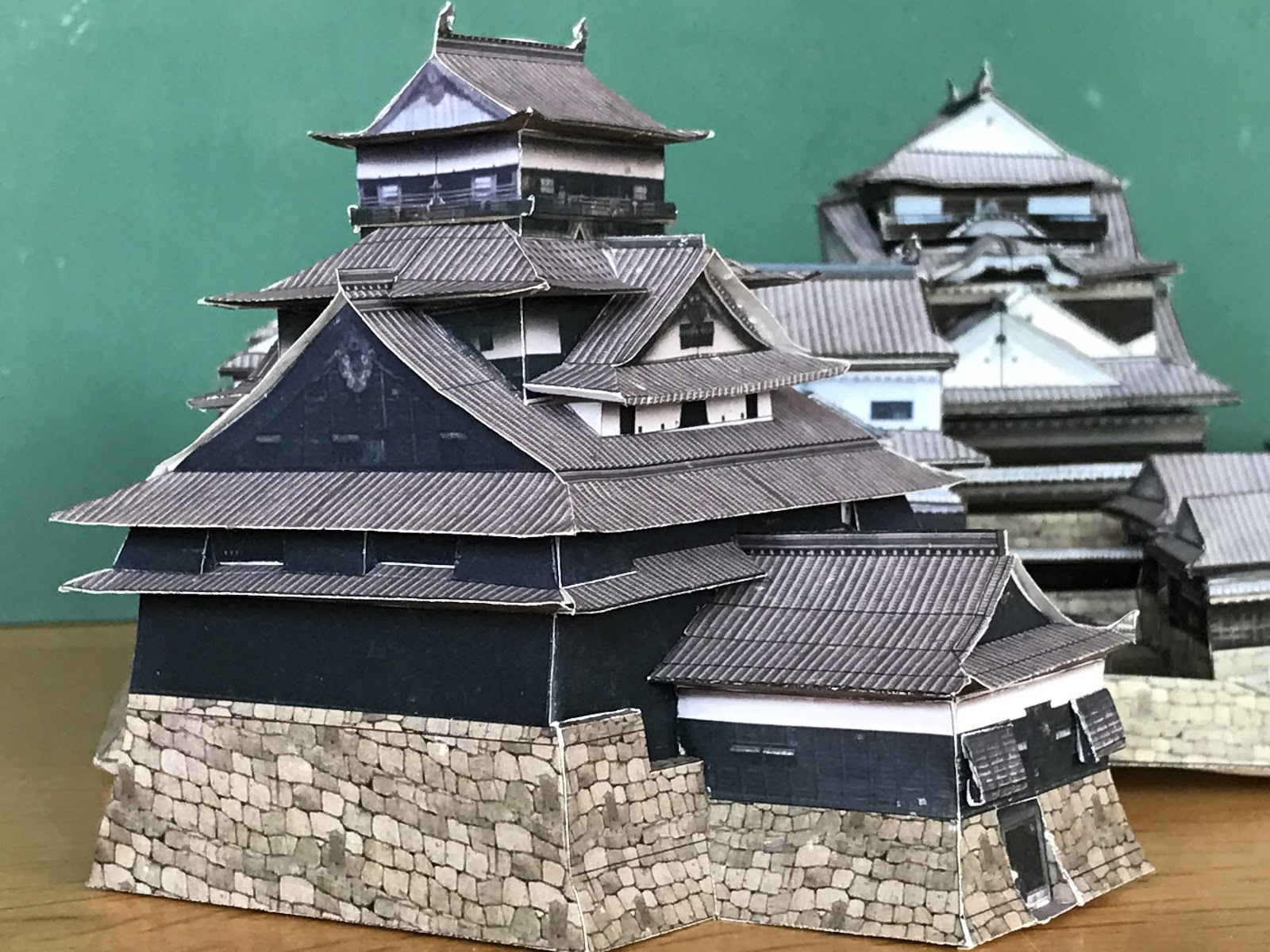 松山城とは別にオリジナルで天守を完成させた松江城と並べてみました。こうやって同じ縮尺で作ったりしていると単に眺めているのとは違っていろんなことに気づきます。たとえば、この二つの城は加藤嘉明、堀尾吉晴という織田・豊臣からの外様大名の西国大名らしく、黒塗漆塗りですが、天守台がほぼ同じ大きさです。なお、松山城天守は幕末の松平家による復古調での再建ですので加藤嘉明のオリジナルの5重のものとは違いますが、松江城のような感じだったのではと想像してみたりできます。
