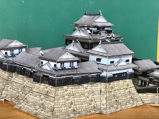 松山城とは別にオリジナルで天守を完成させた松江城と並べてみました。こうやって同じ縮尺で作ったりしていると単に眺めているのとは違っていろんなことに気づきます。たとえば、この二つの城は加藤嘉明、堀尾吉晴という織田・豊臣からの外様大名の西国大名らしく、黒塗漆塗りですが、天守台がほぼ同じ大きさです。なお、松山城天守は幕末の松平家による復古調での再建ですので加藤嘉明のオリジナルの5重のものとは違いますが、松江城のような感じだったのではと想像してみたりできます。