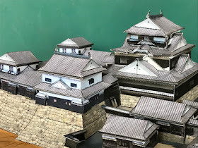 松山城とは別にオリジナルで天守を完成させた松江城と並べてみました。こうやって同じ縮尺で作ったりしていると単に眺めているのとは違っていろんなことに気づきます。たとえば、この二つの城は加藤嘉明、堀尾吉晴という織田・豊臣からの外様大名の西国大名らしく、黒塗漆塗りですが、天守台がほぼ同じ大きさです。なお、松山城天守は幕末の松平家による復古調での再建ですので加藤嘉明のオリジナルの5重のものとは違いますが、松江城のような感じだったのではと想像してみたりできます。