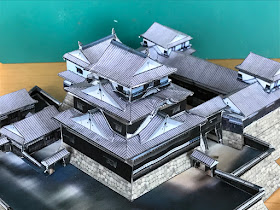 とおもっていたのですが、キヤノンさんのペーパークラフトのサイトで、立派な松山城本壇の型紙が先月2月に公開されてました。本壇下の重文の紫竹門や続き塀まで含んでいて素晴らしいです。しかも、この型紙では省略が著しい一ノ門中の枡形の再現までできています。